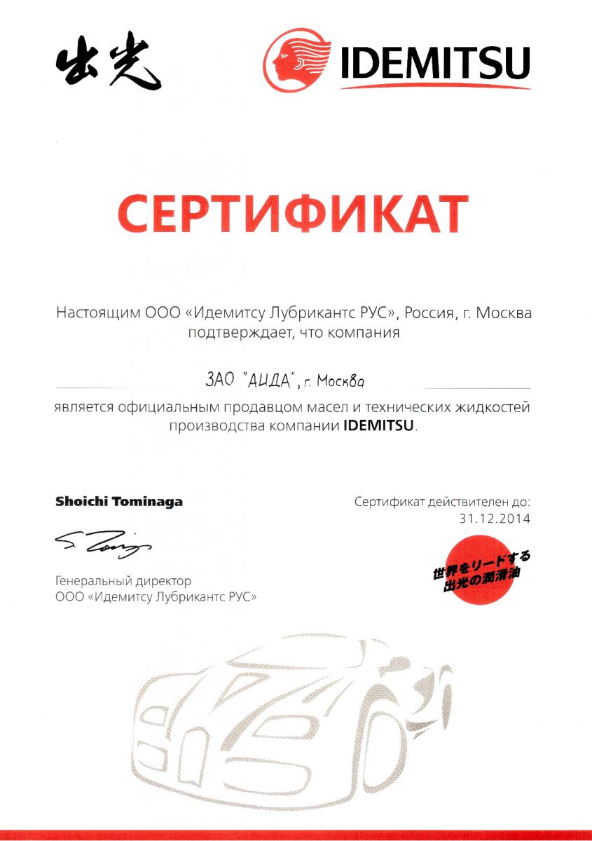 ТехЦентрАИДА получил сертификат подтверждающий, что ЗАО "АИДА" является официальным продавцом масел и технических жидкостей производства компании IDEMITSU.
